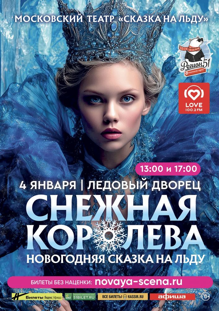 Этот музыкальный спектакль поставлен по мотивам сказки Г.Х. Андерсена «Снежная Королева», в исполнении актеров Московского театра «Сказка на льду». Создатели ледовой сказки в одном представлении объединили прекрасную музыку Гельсят Шайдуловой, музыкальные композиции на слова популярного поэта-песенника Михаила Шаброва. Незабываемое ледовое представление в постановке Ольги Бекиш, красивые костюмы, профессиональные фигуристы и артисты цирка на льду.